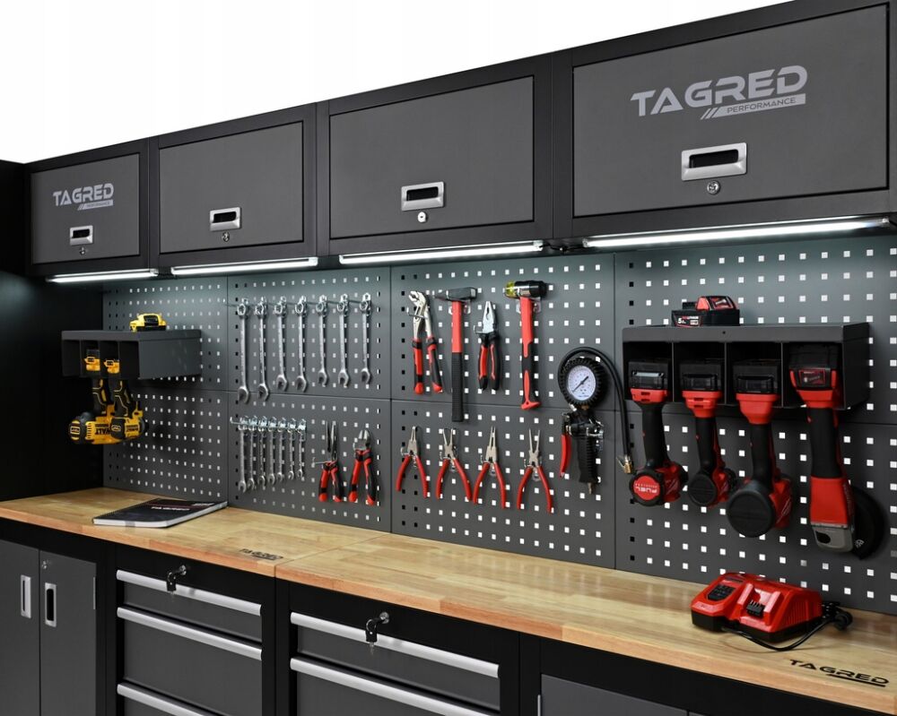 - Kompletny, świetnie wyposażony zestaw mebli warsztatowych TAGRED PERFORMANCE – 2 duże szafy, 8 górnych półek, 8 pojemnych szuflad, dwa mobilne wózki narzędziowe pomogą zapanować nad Twoim miejscem pracy.