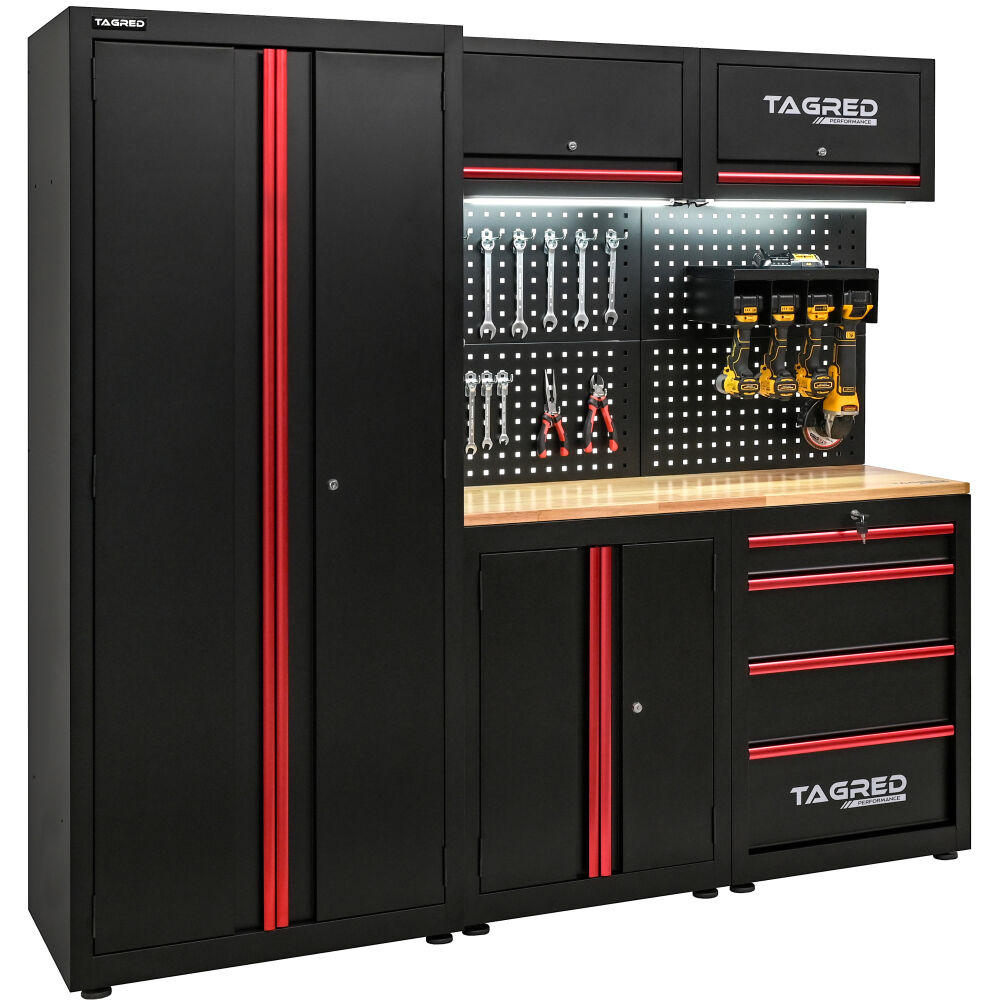 - Kompletny, świetnie wyposażony zestaw mebli warsztatowych TAGRED PERFORMANCE – Duża szafa, górne półki i pojemne szuflady pomogą zapanować nad Twoim miejscem pracy.