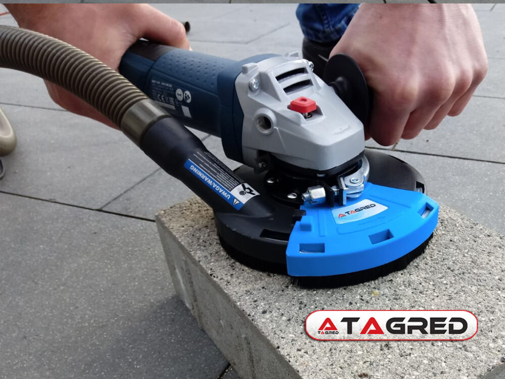 Pokrywa odsysająca z wieńcem szczotkowym to dodatkowe zabezpieczenie podczas szlifowania. Adapter/osłona umożliwia skuteczne odsysanie szkodliwego pyłu podczas szlifowania powierzchni łaskich. Urządzenie mocuje się do kołnierza wrzeciona w miejsce standardowej osłony metalowej co zapewnia szczelne i solidne łączenie osłony ze szlifierką, podczas pracy wszystko jest stabilne, a pył prawie w 100% jest odciągany.