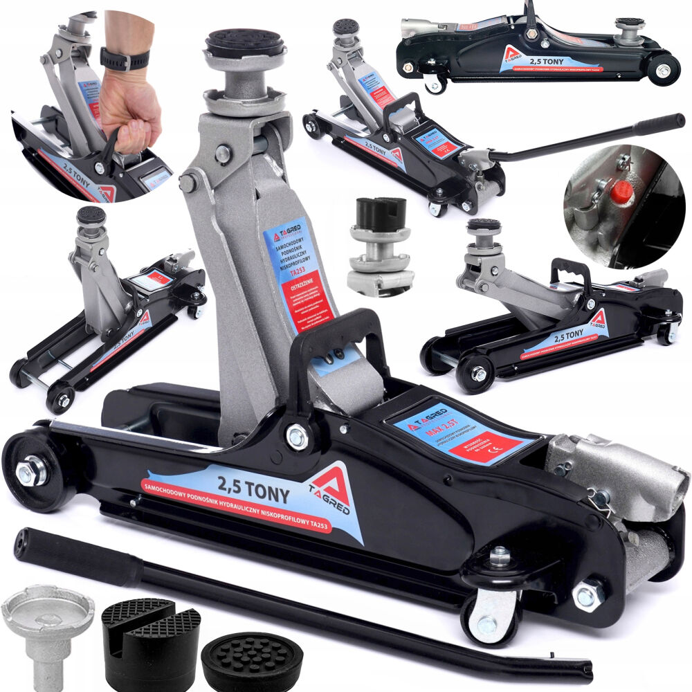 Podnośnik samochodowy 2,5 tony, lewarek niskoprofilowy żaba, 2 gumy, nadstawka