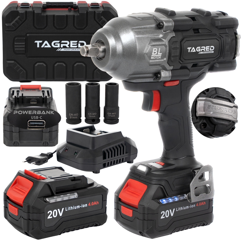 Klucz udarowy akumulatorowy, bezszczotkowy TAGRED TA8000, 2 akumulatory 20V 4Ah 1898Nm do kół 1/2''