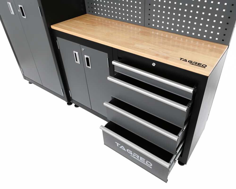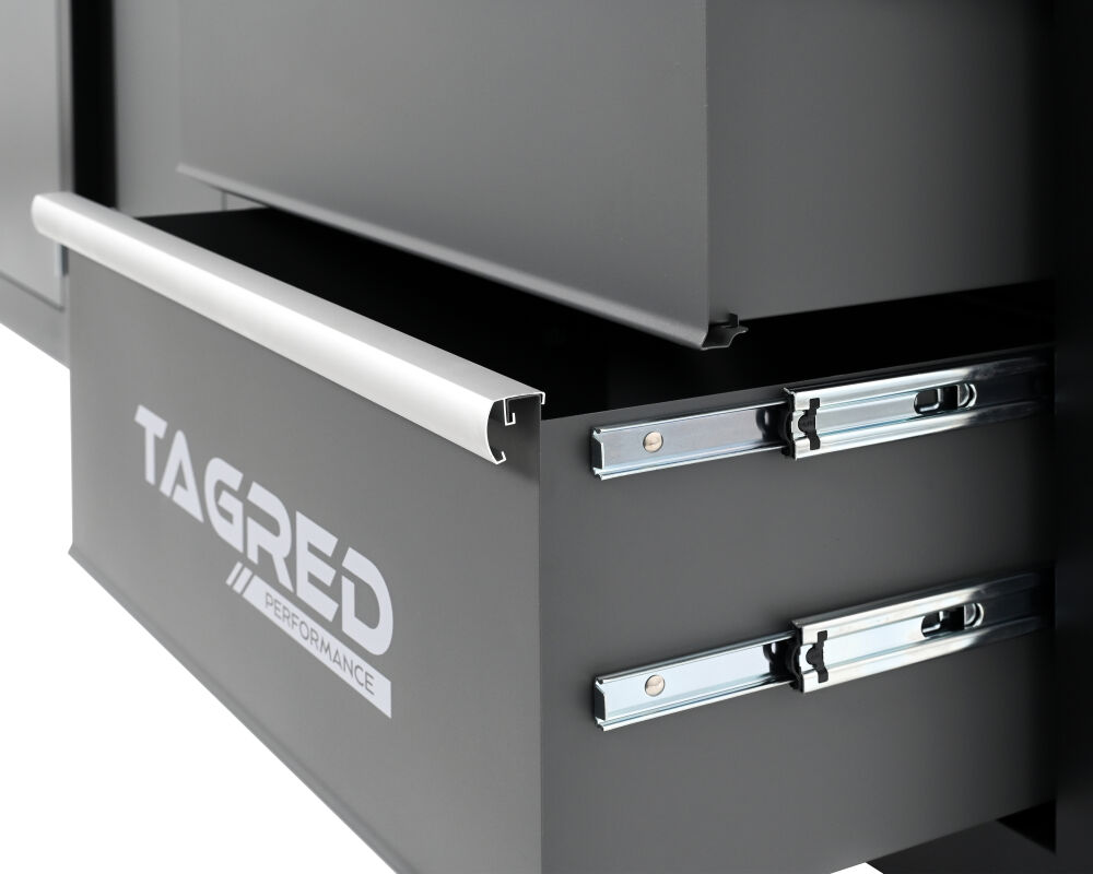 Zestaw TAGRED TA195 został wyposażony w regulowane nóżki, które pozwalają na precyzyjne wypoziomowanie mebli, nawet na nierównej posadzce warsztatowej. To drobny detal, który ma ogromny wpływ na stabilność całej konstrukcji i komfort pracy.