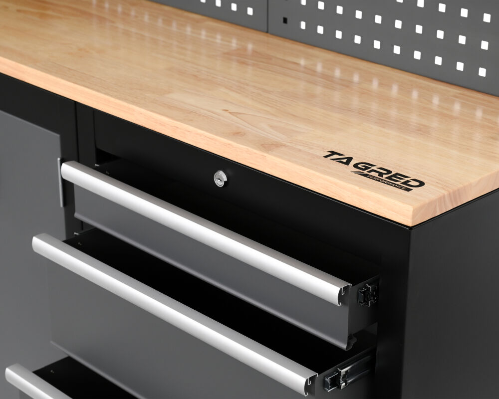 Największa dolna szuflada została wyposażona w podwójne prowadnice kulkowe, dzięki czemu z łatwością wytrzymuje obciążenie aż do 60 kg. To idealne miejsce na przechowywanie cięższych narzędzi, elektronarzędzi czy części maszyn.