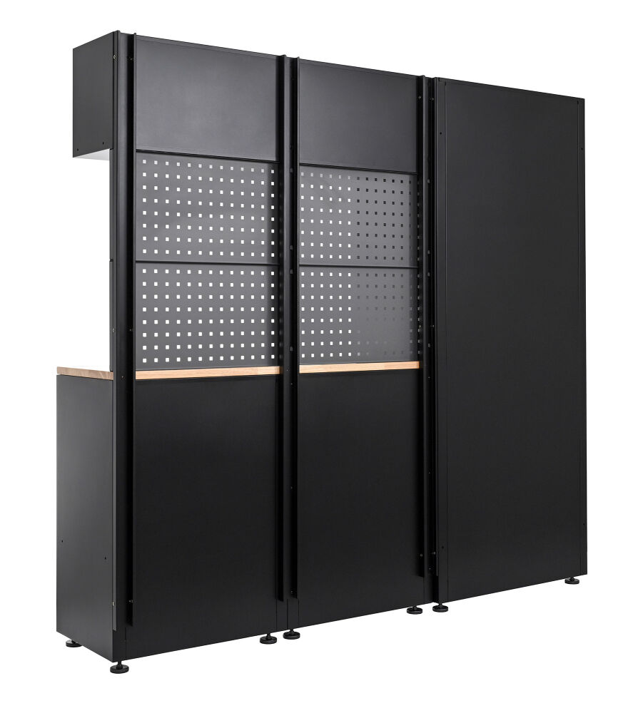 W skład zestawu wchodzą: duża szafa, szafa dolna z półką, szafa dolna z szufladami, panel perforowany oraz blat roboczy.