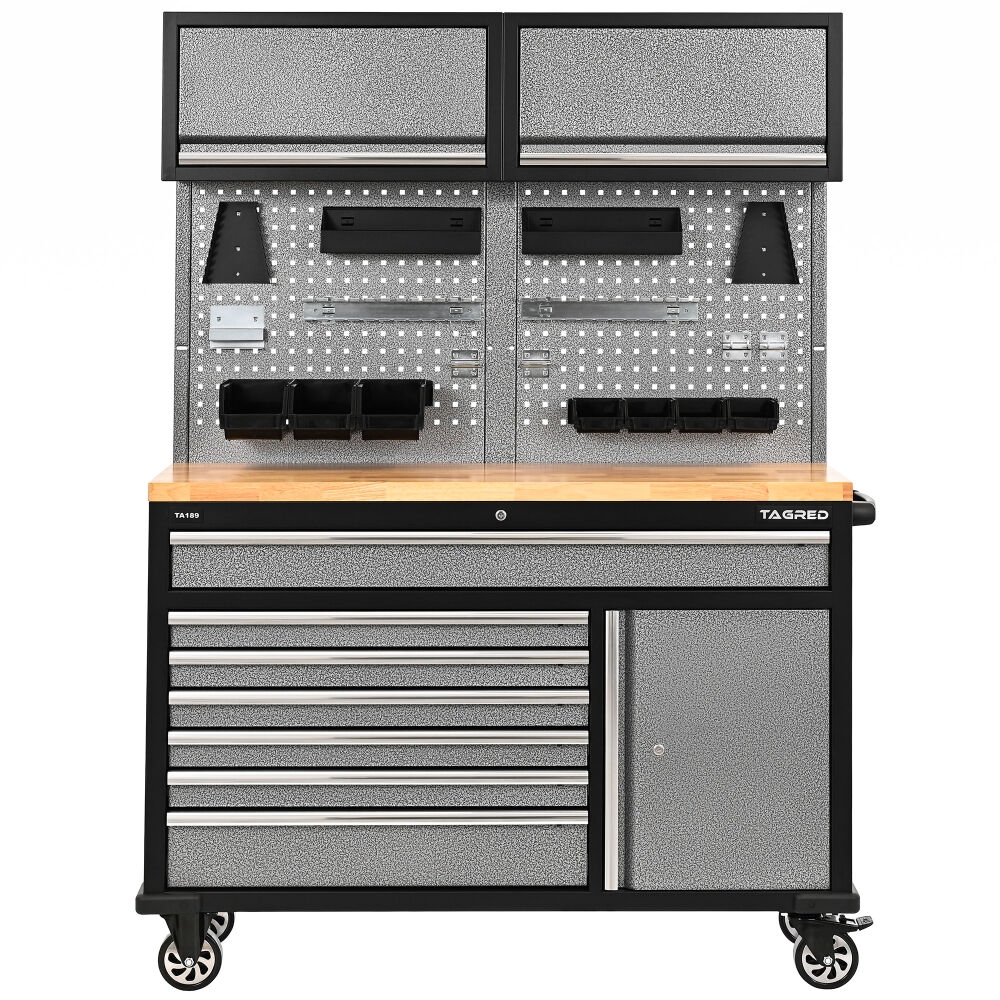 Zestaw TA189 pozwala na perfekcyjną organizację przestrzeni dzięki bogatemu wyposażeniu. Składa się z mobilnego wózka serwisowego z przestronnymi szufladami z wyściółką, dużej tablicy narzędziowej zbudowanej z dwóch paneli z perforowanej stali oraz górnego modułu zamykanych półek wyposażonych w siłowniki. Mobilność konstrukcji, dużą swobodę w przemieszczaniu zapewniają wzmocnione koła w tym dwa koła skrętne z hamulcami. Tak ogromna ilość miejsca na narzędzia sprawia, że jest to idealny wybór do każdego profesjonalnego warsztatu, serwisu, czy garażu hobbysty.