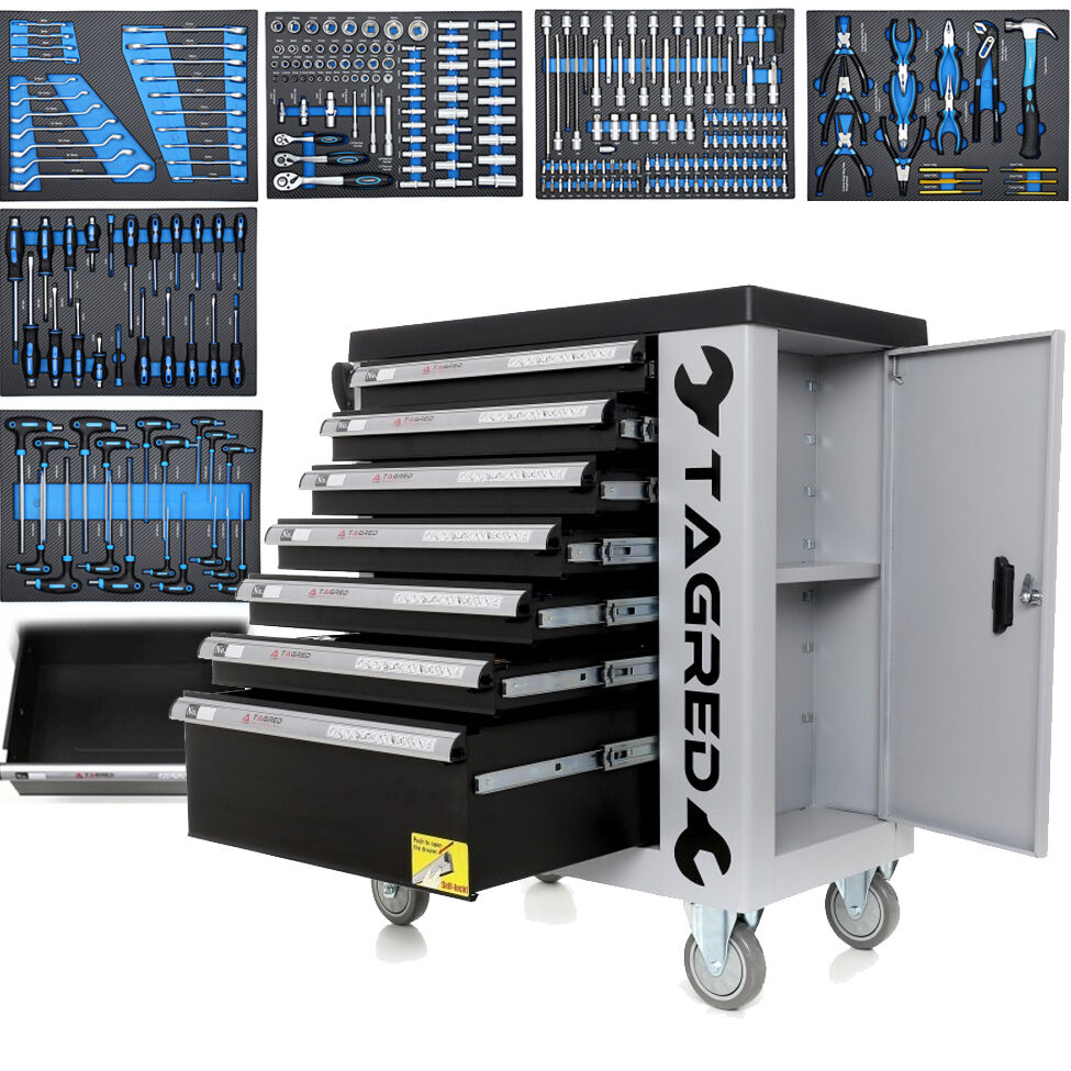 Szafka z narzędziami pozwala utrzymać porządek na stanowisku pracy, a także chroni narzędzia przed kradzieżą (wózek zamykany na kluczyk). Wózek posiada ergonomiczne uchwyty zintegrowane z blatem, w pełni wysuwane szuflady na łożyskach. Centralny zamek z dwoma kluczami zamykający wszystkie szuflady oraz podwójne ścianki i blokadę szuflad. Wózek wyposażony został w 4 kółka co bardzo ułatwia transport. Dodatkowo posiada narożniki odbojniki (chronią przed przypadkowym uszkodzeniem np. karoserii samochodu). Blat został uniwersalnie perforowany (wykonany z polipropylenu). W zestawie znajduje się pusta szuflada. Jest też dwupoziomowy składzik zamykany na klucz. W skład zestawu wchodzą klucze płasko-oczkowe oraz klucze typu poligon.