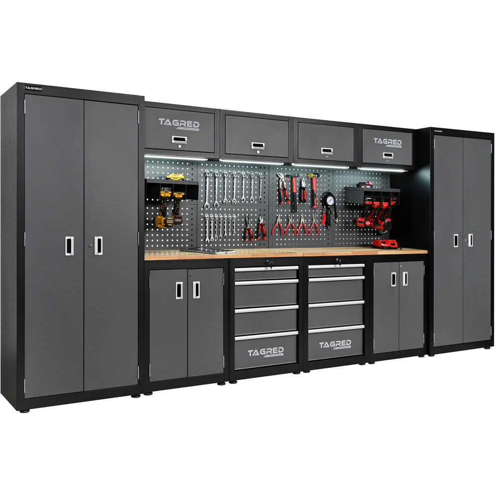 - Kompletny, świetnie wyposażony zestaw mebli warsztatowych TAGRED PERFORMANCE – 2 duże szafy, 8 górnych półek, 8 pojemnych szuflad, dwa mobilne wózki narzędziowe pomogą zapanować nad Twoim miejscem pracy.