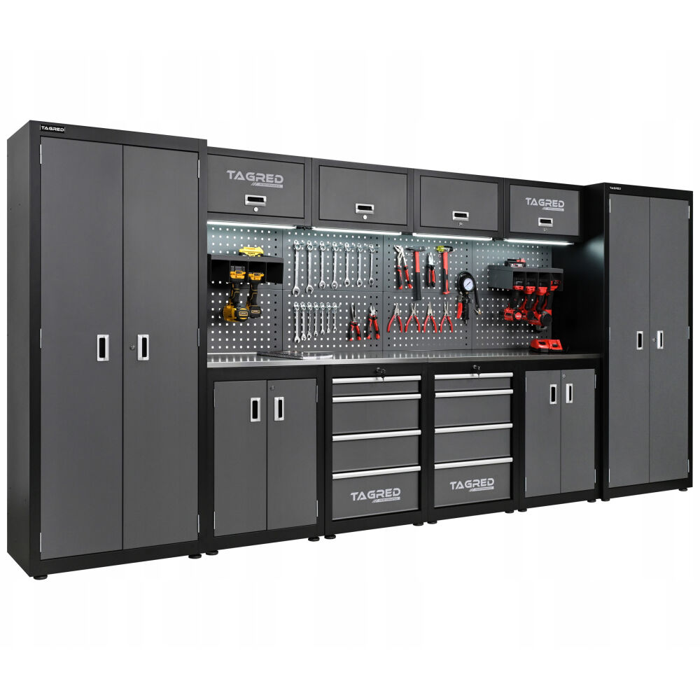 - Kompletny, świetnie wyposażony zestaw mebli warsztatowych TAGRED PERFORMANCE – 2 duże szafy, 8 górnych półek, 8 pojemnych szuflad, dwa mobilne wózki narzędziowe pomogą zapanować nad Twoim miejscem pracy.