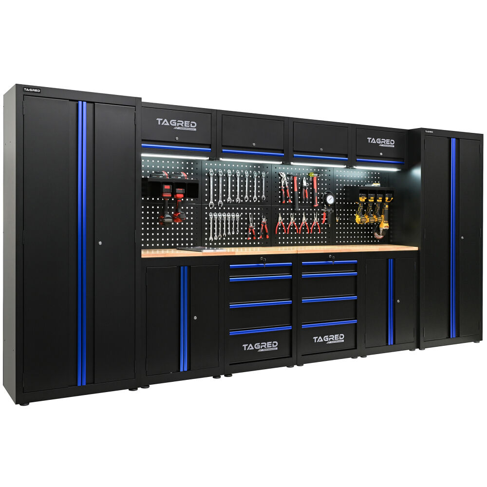 - Kompletny, świetnie wyposażony zestaw mebli warsztatowych TAGRED PERFORMANCE – 2 duże szafy, 8 górnych półek, 8 pojemnych szuflad, dwie szafki narzędziowe pomogą zapanować nad Twoim miejscem pracy.