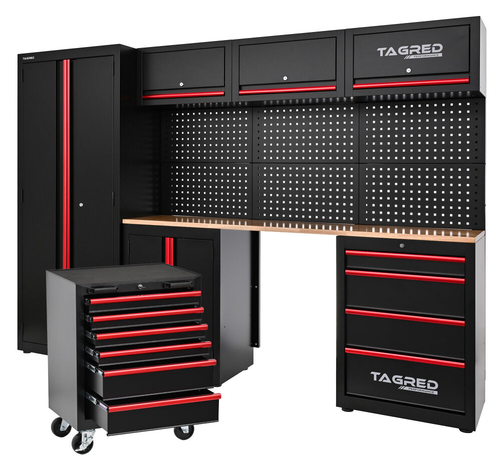 Zestaw TAGRED TA194 został wyposażony w regulowane nóżki, które pozwalają na precyzyjne wypoziomowanie mebli, nawet na nierównej posadzce warsztatowej.