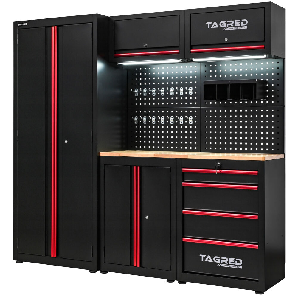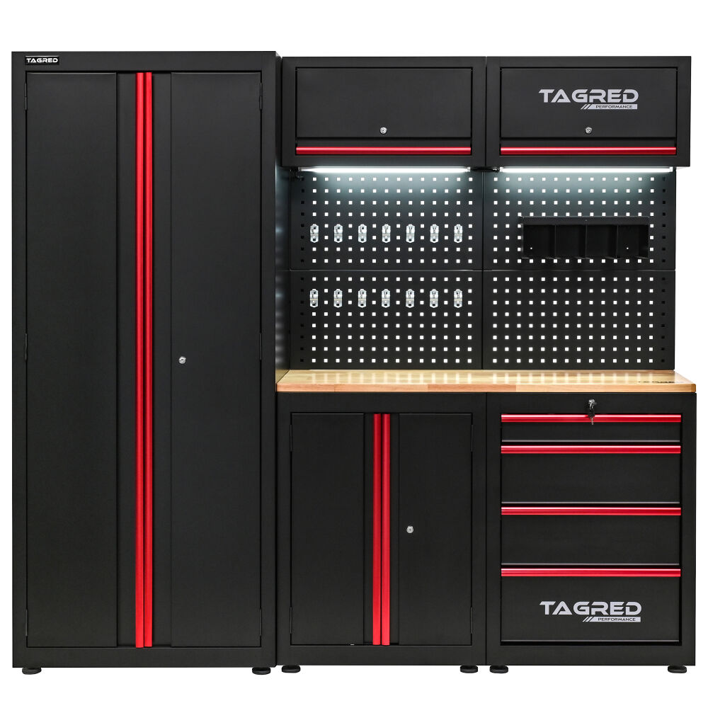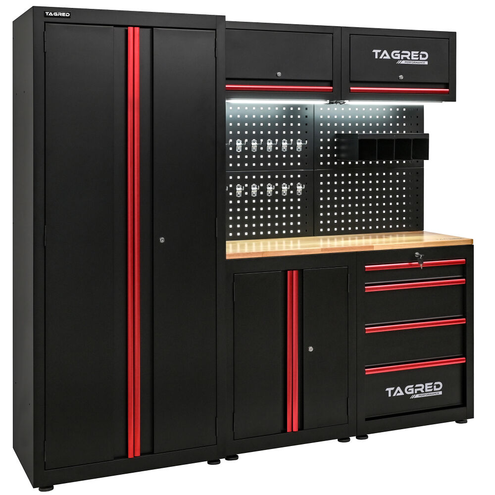 - Kompletny, świetnie wyposażony zestaw mebli warsztatowych TAGRED PERFORMANCE – Duża szafa, górne półki i pojemne szuflady pomogą zapanować nad Twoim miejscem pracy.