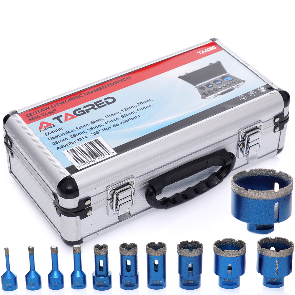 Otwornice, koronki diamentowe do ceramiki, kamienia, gresu, glazury 6-68mm M14, walizka, 12-el.