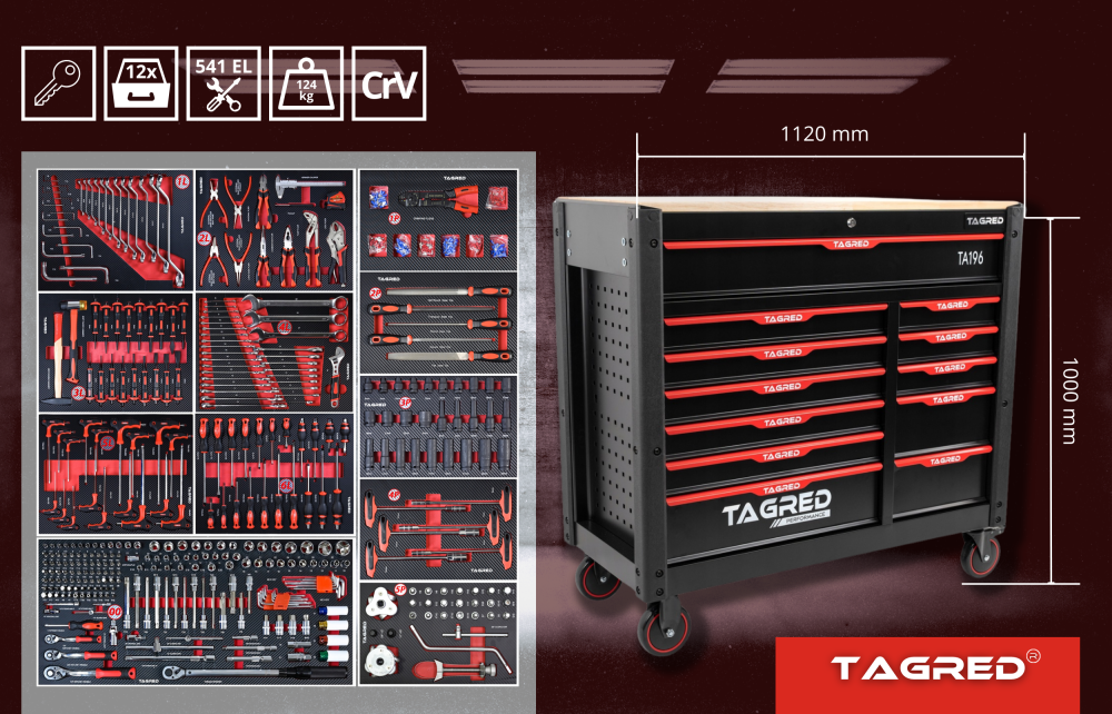 Wózek warsztatowy Tagred wyposażono w komplementarny zestaw najwyższej jakości narzędzi, który spełni potrzeby nawet najbardziej wymagającego użytkownika. Bogate wyposażenie szafy TAGRED pozwoli spersonalizować zestaw narzędzi pod potrzeby najbardziej wymagających wyzwań warsztatowych