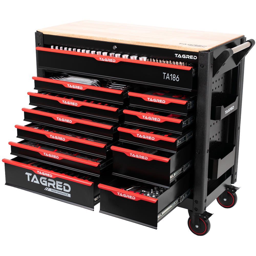 Wózek warsztatowy Tagred wyposażono w komplementarny zestaw najwyższej jakości narzędzi, który spełni potrzeby nawet najbardziej wymagającego użytkownika. Bogate wyposażenie szafy TAGRED pozwoli spersonalizować zestaw narzędzi pod potrzeby najbardziej wymagających wyzwań warsztatowych